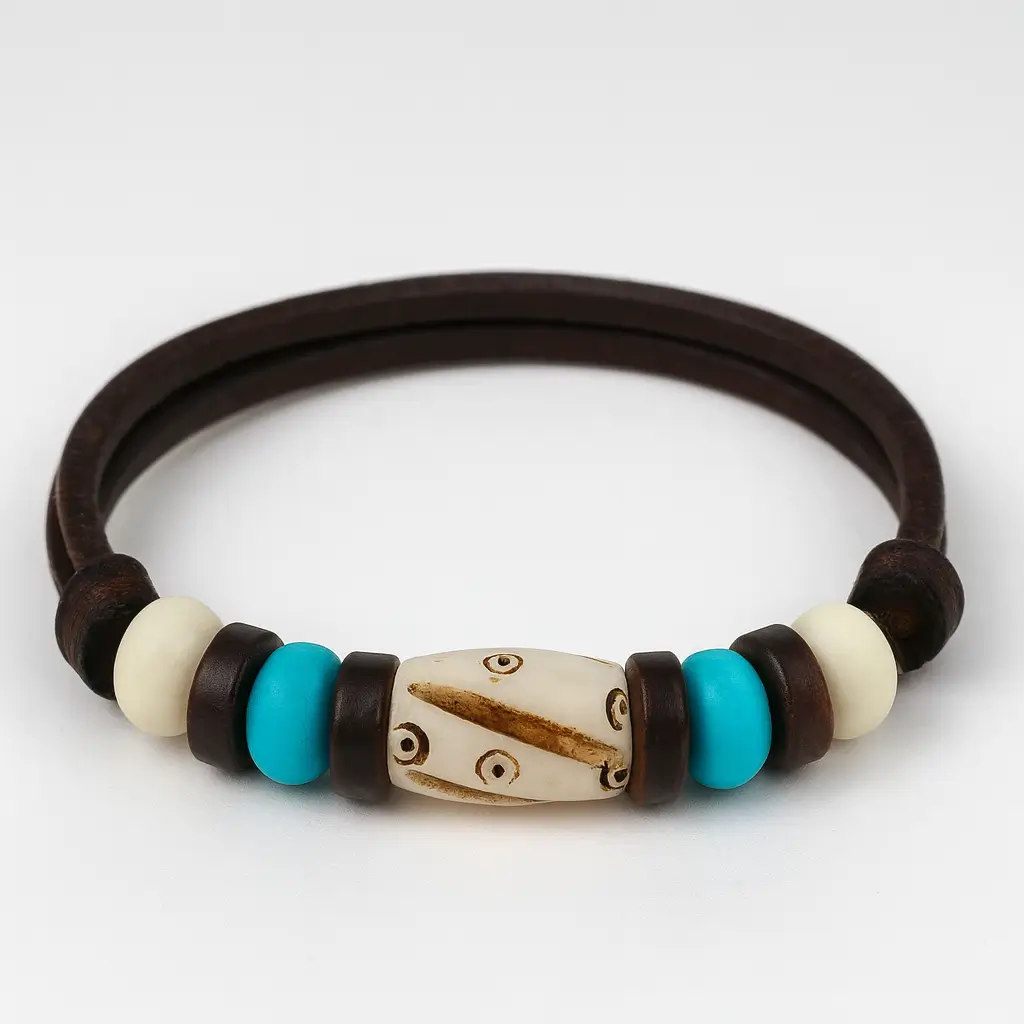| Materialien | Hochwertiger Rindsleder, Büffel Knochen, Kokosnuss Ringe. |