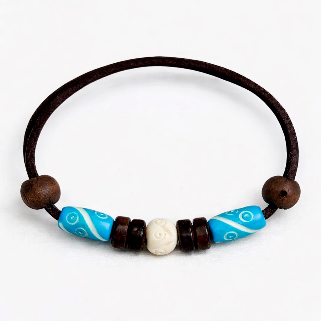 | Materialien | Rindsleder, Knochen, Kokosnuss Perlen. |